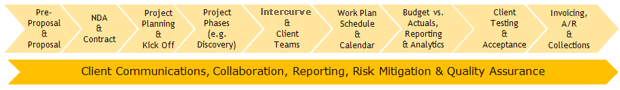 ClientCentral is Intercurve’s comprehensive and integrated automated process on Microsoft’s SharePoint for communicating, collaborating, sharing content and conducting engagements with our clients. ClientCentral supports the entire Continuum of Client Service throughout our client relationship and engagement process. ClientCentral begins at the pre-proposal and proposal stage with our prospects and clients and extends through the entire project through client acceptance, invoicing and collections. The major processes of ClientCentral include pre-proposal and proposal; NDA and contract; project planning and kick-off; project phases (e.g., discovery, design, development, integration, deployment, support); Intercurve and client project team members; workplan, schedule and calendar; summary budget versus actual of time and cost, reporting and analytics; client testing and acceptance; and invoicing, A/R and collections as shown above.