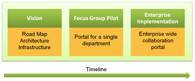 Intercurve has developed Best Practices for Implementation of SharePoint in enterprises. This includes a phase wise implementation beginning with one department and replication across the enterprise. A schematic for this process is shown below.