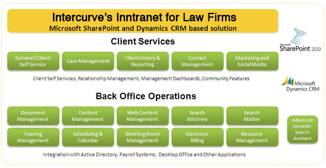 Intercurve's Intranet for Law Firms is built using foundation of Microsoft SharePoint 2010 with minimal customization and seamless integration with Dynamics CRM. Our Intranet solution provides a suite of server based solutions that is largely delivered through consistent and familiar interfaces of Microsoft Office applications such as Word, Excel, Outlook, etc. .