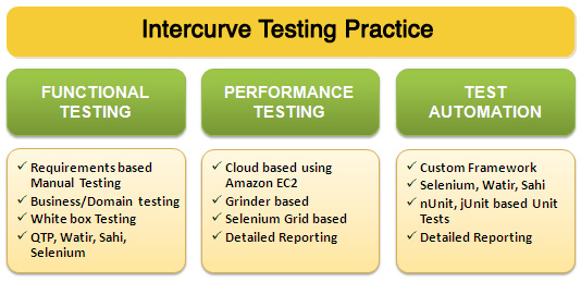 Intercurve's QA and Testing Practice is composed of experienced professionals who are passionate about ensuring the quality, performance and user experience of customer products and applications. Our testing team has experience in multiple domains and technologies and has established best practices, frameworks and tools to methodically perform testing activities. Our professionals can work closely with the developers and play a vital role in development teams that follow a Test Driven approach to developing code.