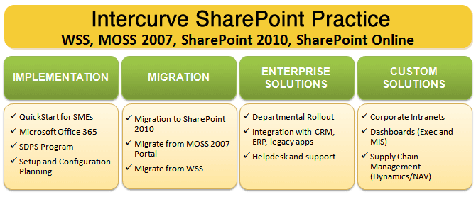 Intercurve helps customers develop and deploy SharePoint solutions including intranets, portals, collaboration platforms, departmental solutions workflows and custom portals. Our team of SharePoint experts, ensures that your SharePoint solution meets your portal and other functional needs while allowing your IT resources to remain focused on your company's core business.
